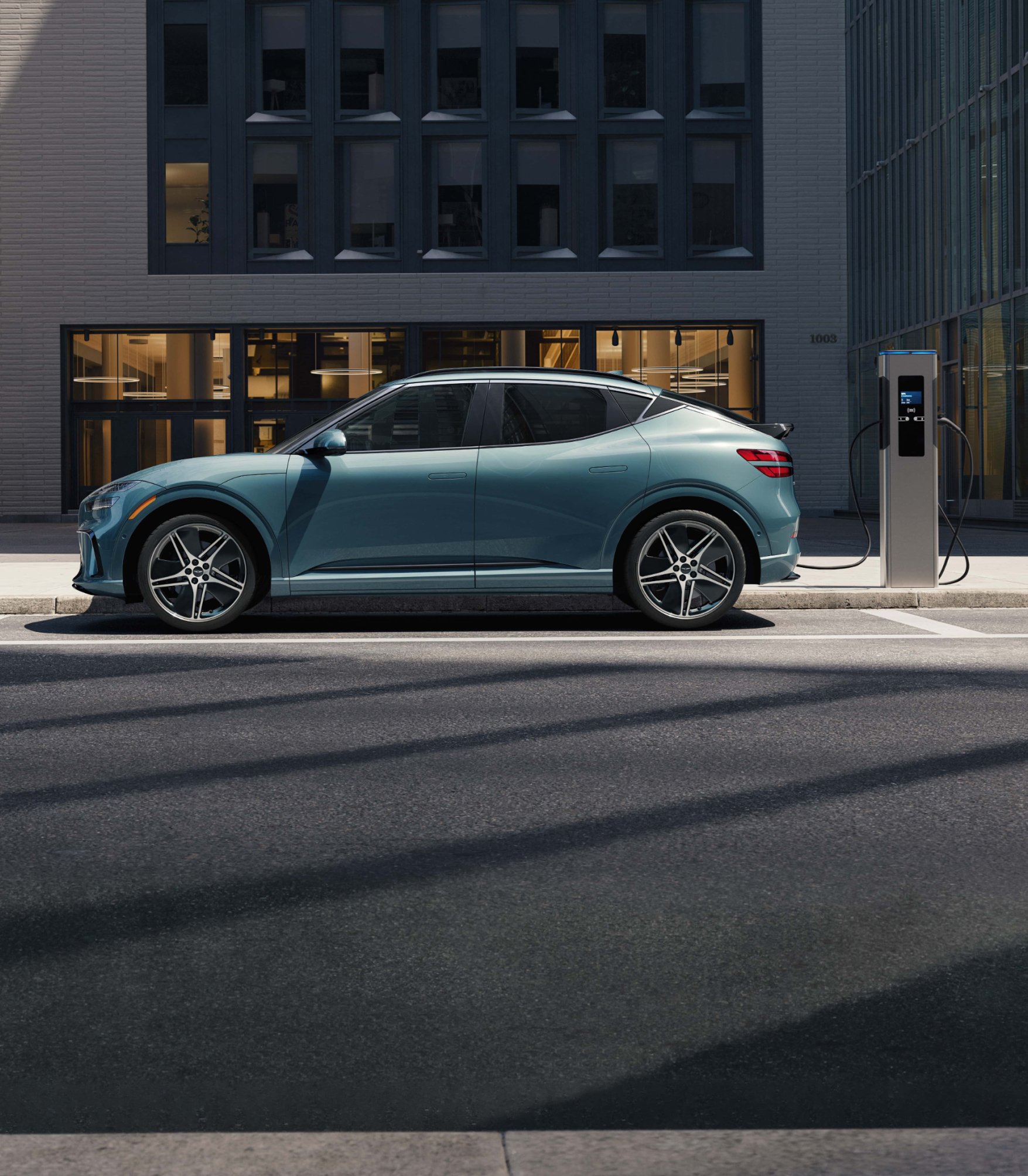 Les phares arrière à double ligne emblématiques sont intégrés de manière harmonieuse aux lignes élégantes de la carrosserie, tandis que un aileron arrière fixe, positionné à l’extrémité du toit de style coupé, renforce davantage le design électrique innovant du GV60.