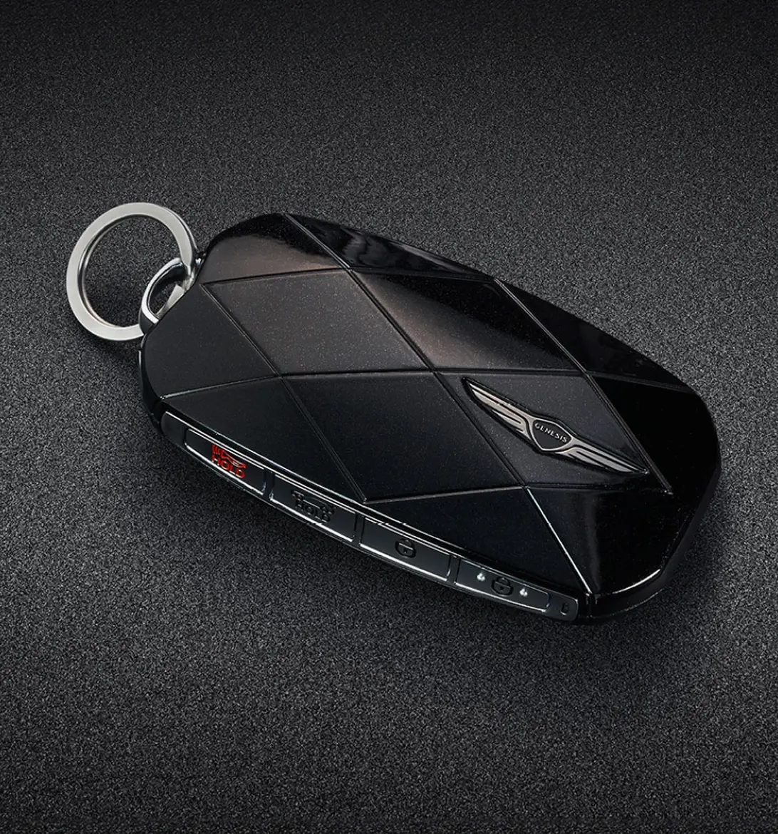 La clé intelligente, inspirée du motif G-Matrix et conçue pour la Genesis Noire, présente une teinte noire exclusive où un noir intense rencontre une surface délicatement lustrée.